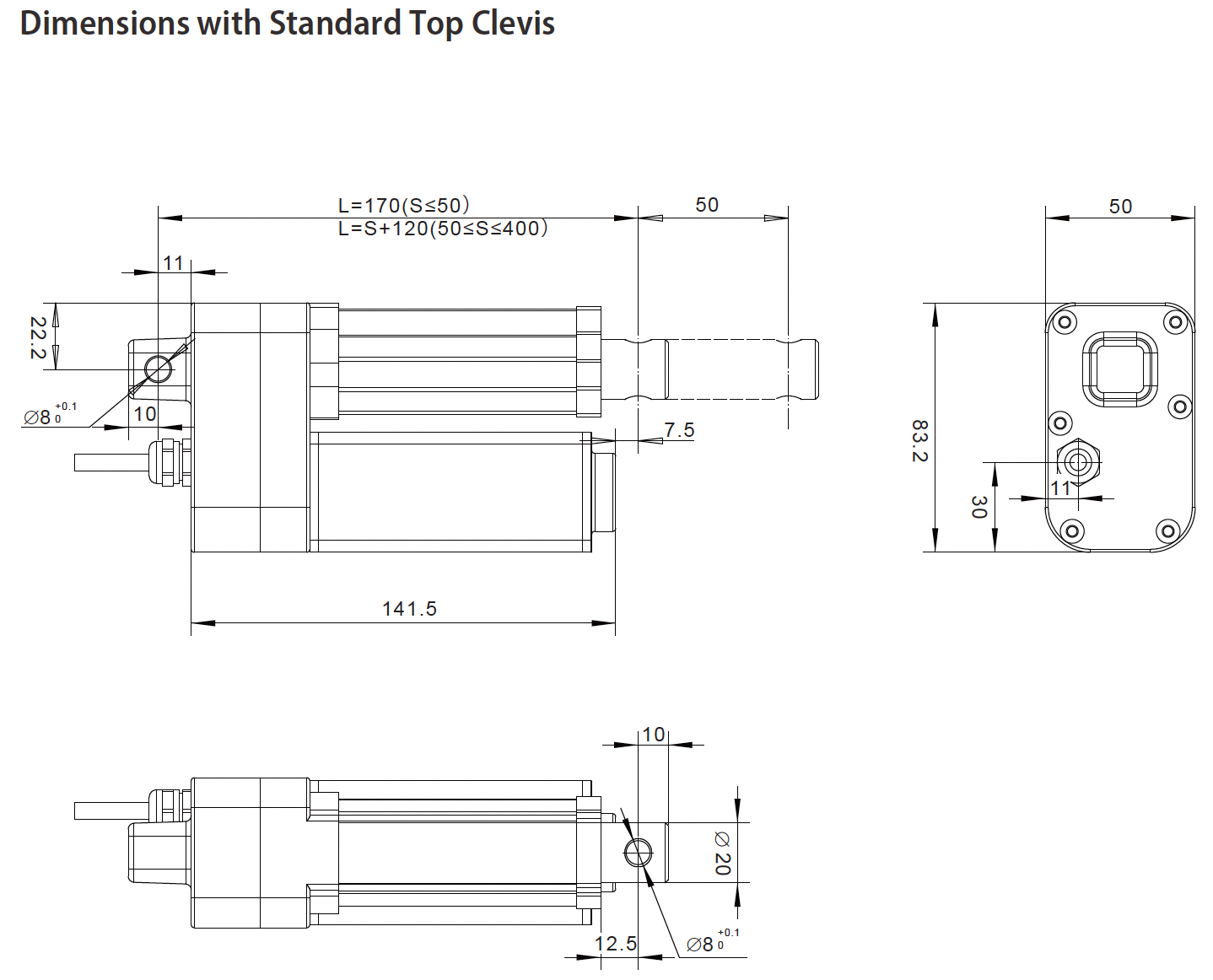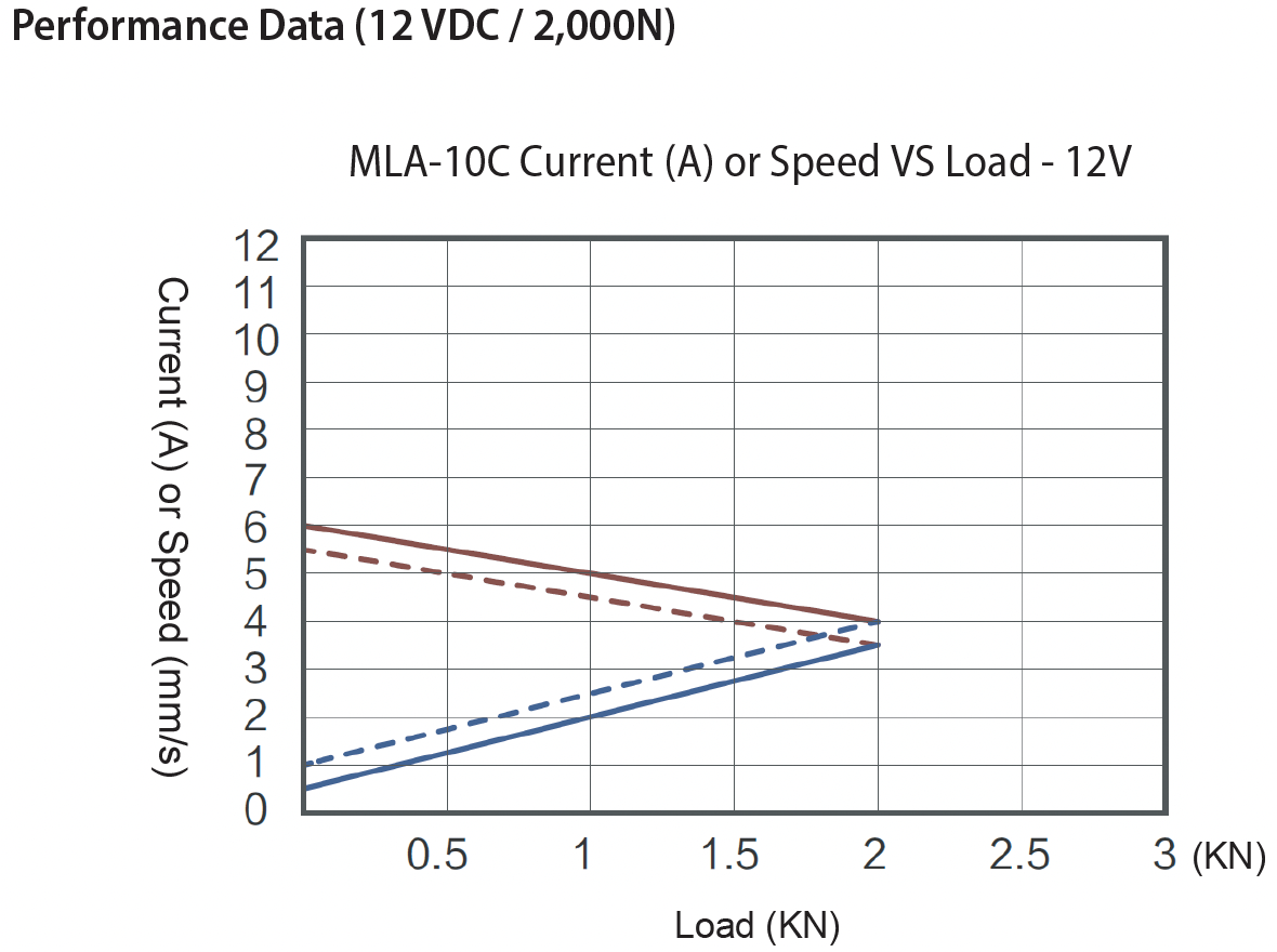 | Power Supply (VDC) | Stroke Length (mm) | Spindle Pitch (mm) | Max. Load Push (N) | Self-Lock Load (N) | Max. No Load Speed (mm/s) | Max. Full Load Speed (mm/s) | Current at Full Load (A) |