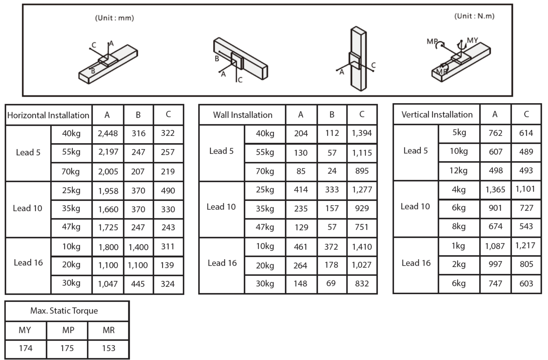 | Ball Screw Lead (mm) | 5mm | 10mm | 16mm | 20mm |