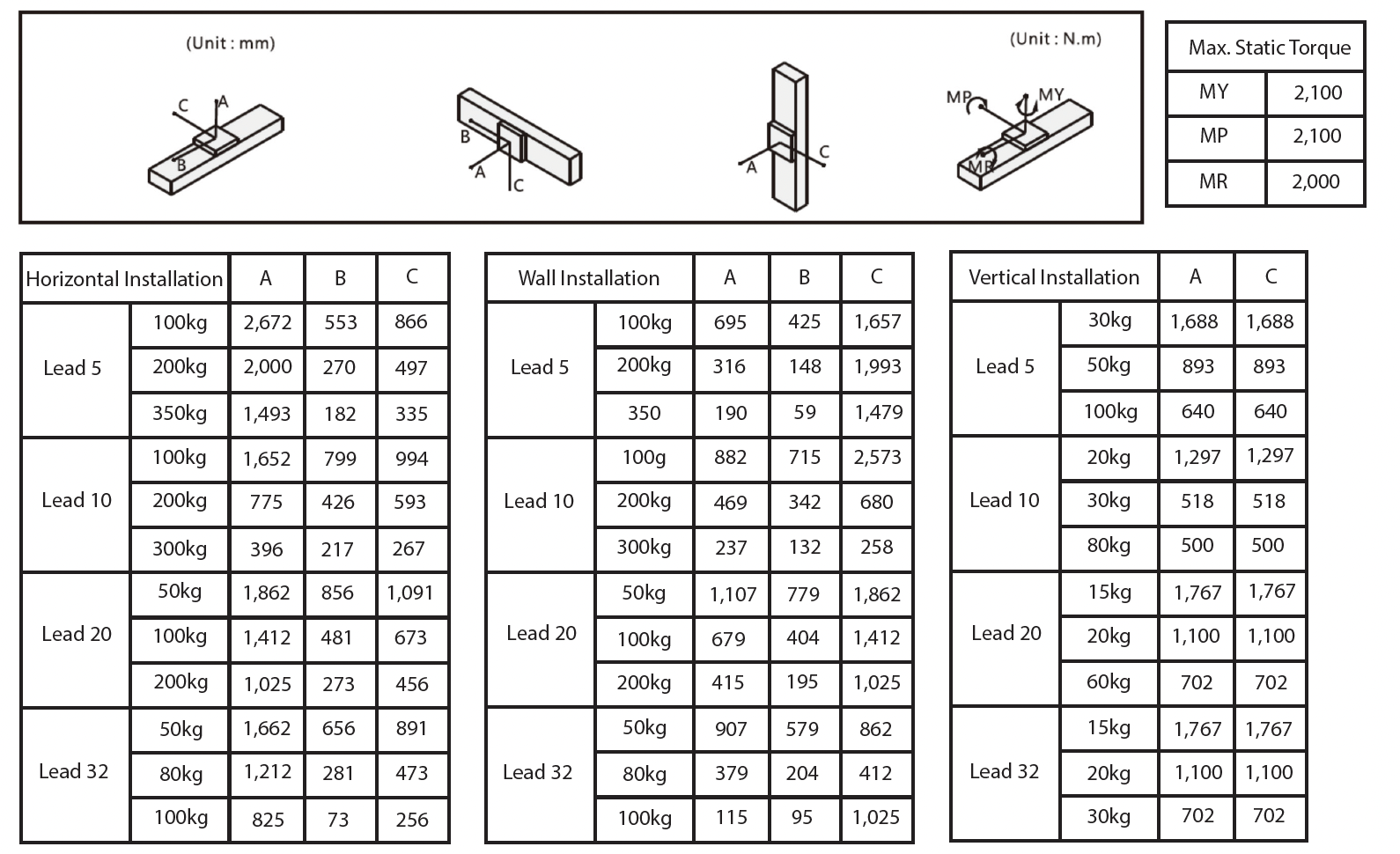 | Ball Screw Lead (mm) | 5mm | 10mm | 20mm | 32mm |
