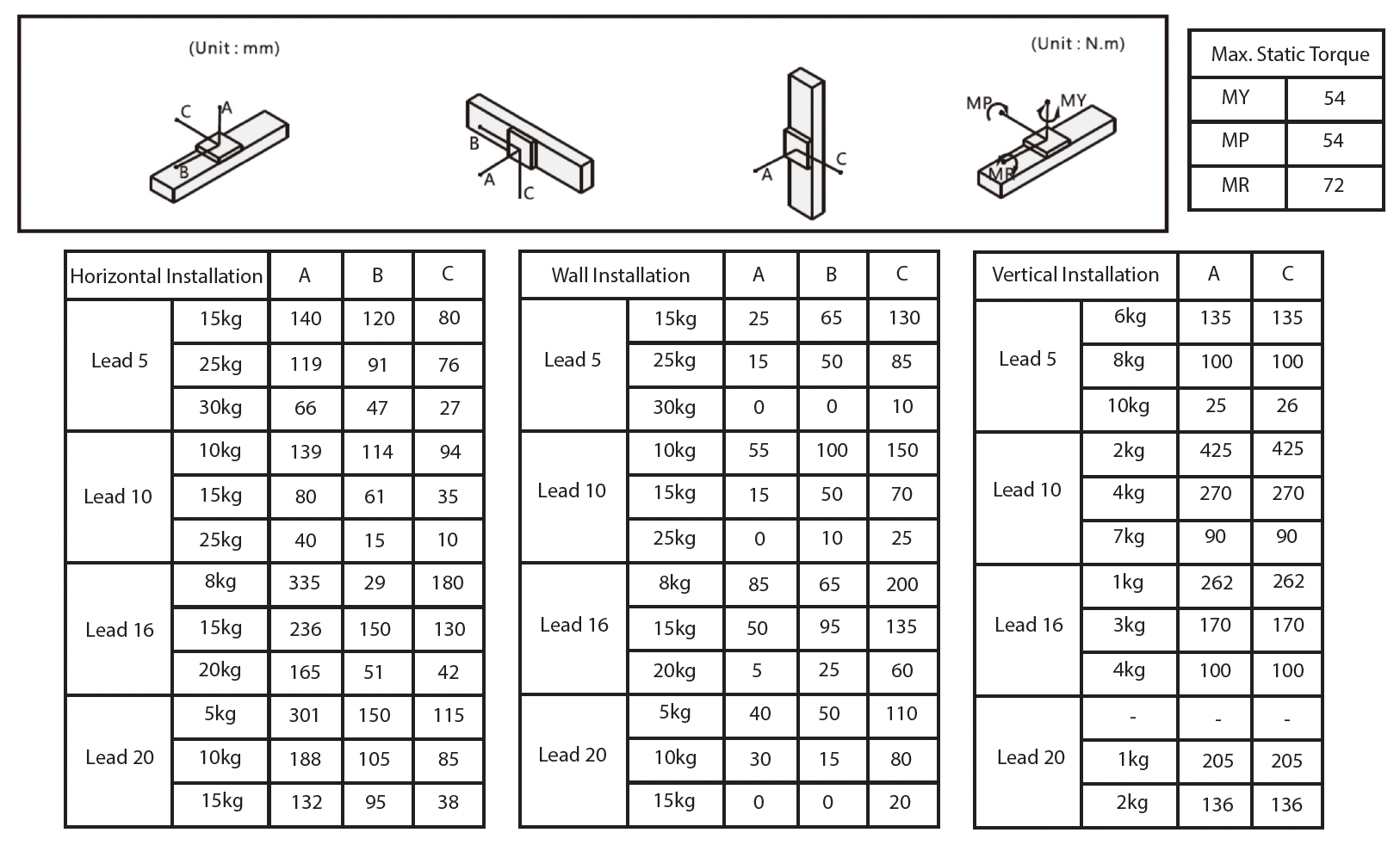 Ball Screw Lead (mm)5mm10mm16mm20mm